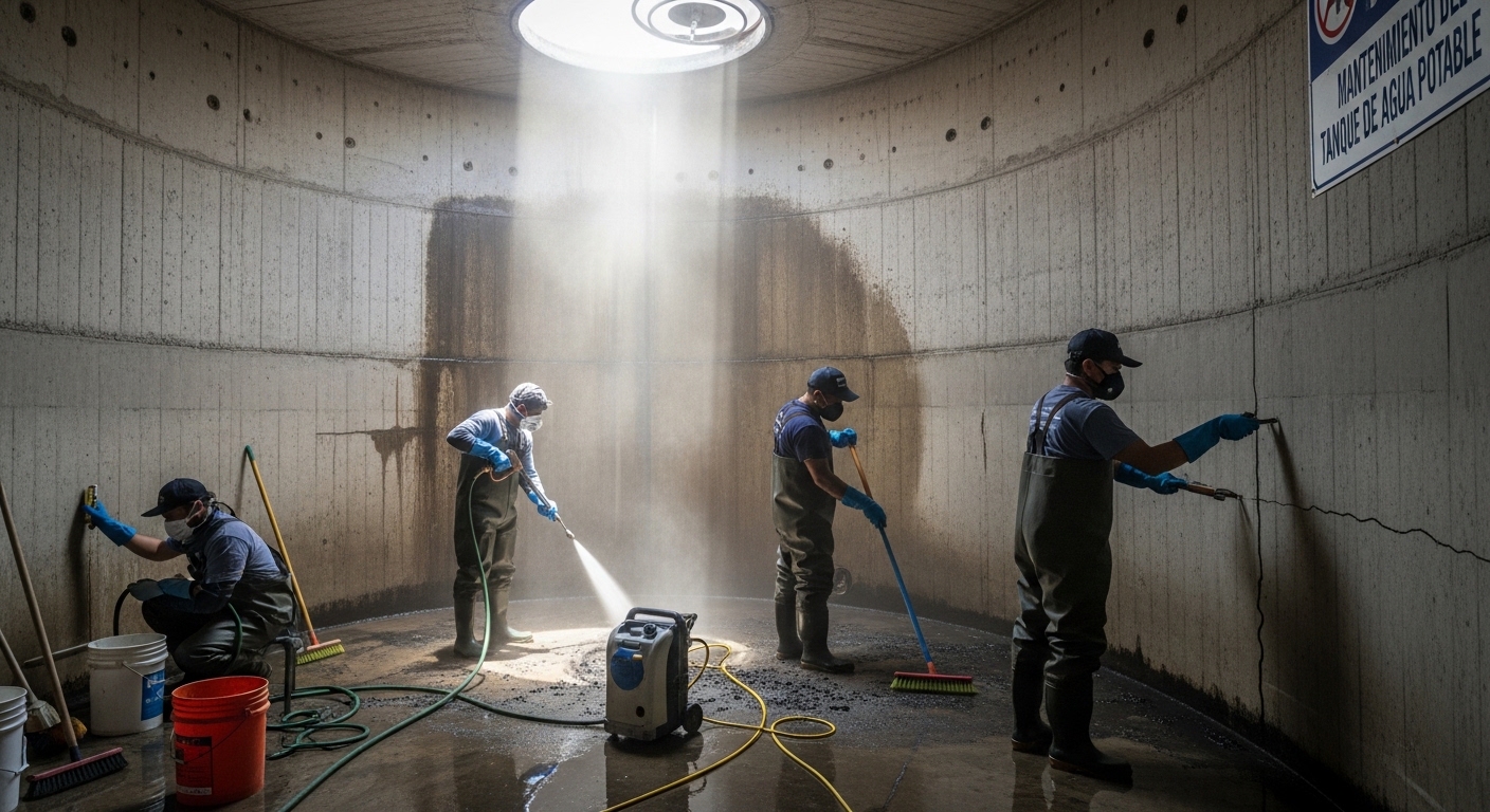 Realizamos limpieza completa de estanques de agua potable, incluyendo desinfección, retiro de lodos y sedimentos, además de reparación de filtraciones para asegurar condiciones sanitarias adecuadas.