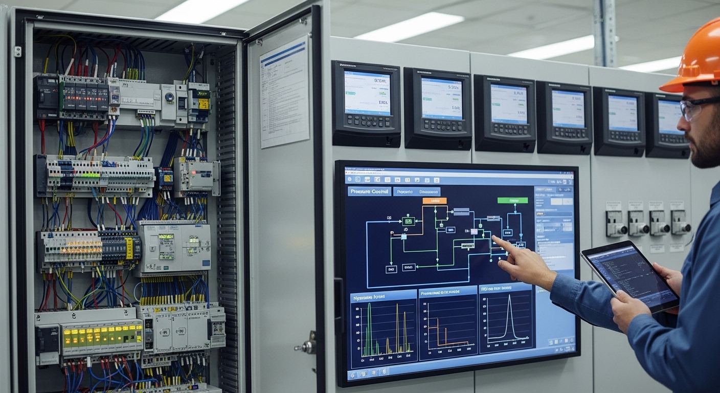 Diseñamos e implementamos sistemas de automatización mediante programación de PLC, configuración de HMI y control por presión (histéresis y PID). Integramos variadores de frecuencia para optimizar el rendimiento y consumo energético.